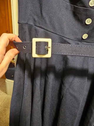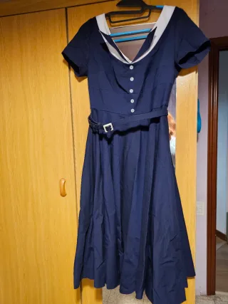 Vestido estilo pin up con un diseño clásico y elegante. - Cuello blanco tipo marinero. - Cinturón a juego. - Cierre de botones en la parte delantera.
