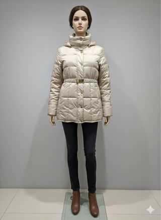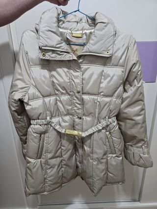 Elegante abrigo de El Corte Inglés en color beige. Presenta un diseño acolchado y cinturón ajustable. - Cuello alto con solapa. - Cierre de botones dorados. - Cinturón elástico con hebilla dorada. - Bolsillos laterales con cremallera.