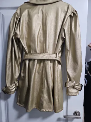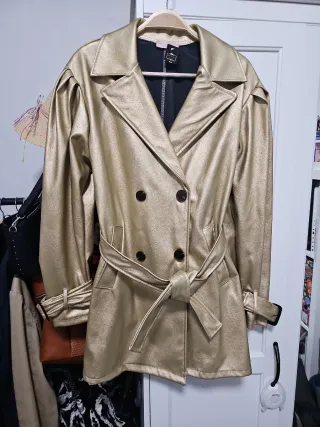 Gabardina elegante de color dorado, con un diseño moderno y llamativo. Perfecta para añadir un toque de estilo a cualquier atuendo. - Cierre cruzado con botones. - Cinturón a juego para ajustar la silueta. - Puños con trabillas. - Hombros con detalle fruncido.
