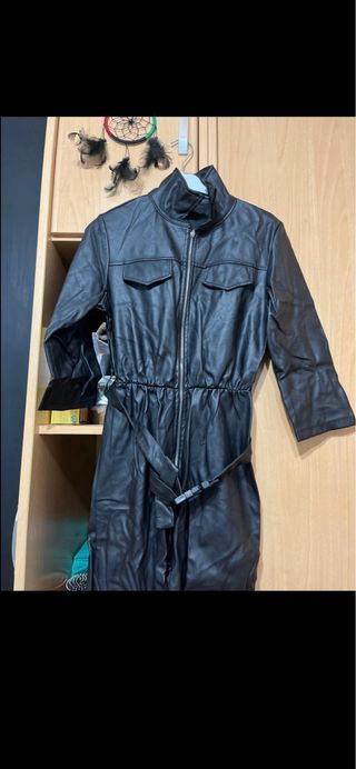 Mono de cuero negro con cinturón. - Cierre de cremallera frontal. - Bolsillos en el pecho. - Cintura elástica con cinturón a juego. - Se ha usado 1 vez.