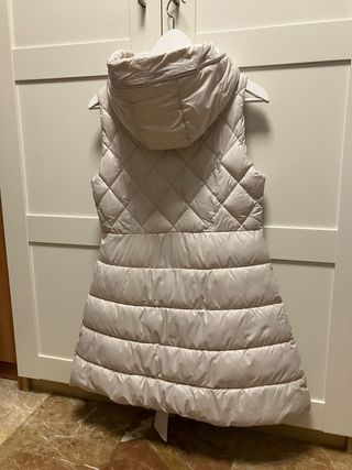 Chaleco largo entallado con capucha. Sienta fenomenal. Es muy ligero y cómodo. Abriga sin agobiar. La tela tiene un tono satinado, que no llega a brillar pero tampoco es mate. La cremallera es doble para abrir por arriba y por abajo. Cuenta con cinturón opcional y una cinta para la capucha.