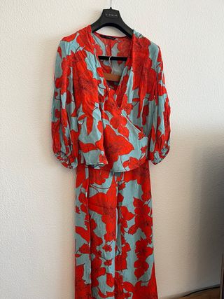 Traje floral azul y coral. Marca Sfera. Camisa talla M. Pantalón talla 40 con cremallera lateral y cinturón. Cintura no elástica.