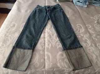 Pantalón vaquero de corte recto con un diseño original en los bajos. - Detalle de bajos anchos con tela de rayas. - Cintura con trabillas para cinturón.