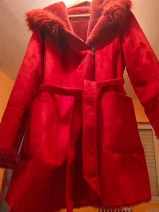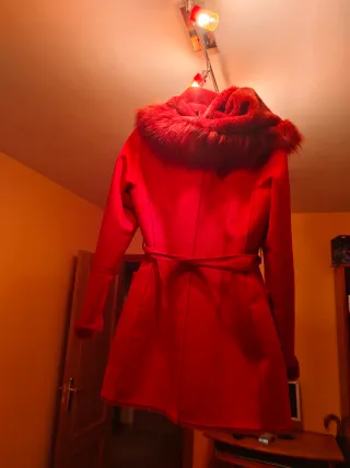 Elegante abrigo de color rojo, perfecto para mantenerte abrigado con estilo. - Capucha con detalle de pelo. - Cinturón para ajustar la cintura. - Puños y bajo con acabado de pelo.