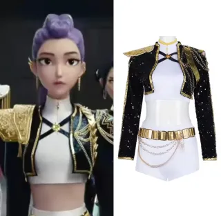 Conjunto de disfraz inspirado en Rumy, con detalles en negro y dorado. Varias tallas - Chaqueta corta brillante. - Top blanco. - Cinturón con cadenas. - Hombreras doradas.