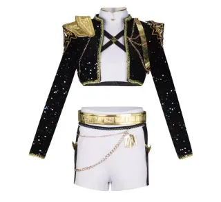 Conjunto de disfraz inspirado en el K-Pop, con un diseño elegante y llamativo. - Top corto con detalles dorados y hombreras. - Falda con cinturón adornado y cadenas. - Incluye dos accesorios circulares dorados.