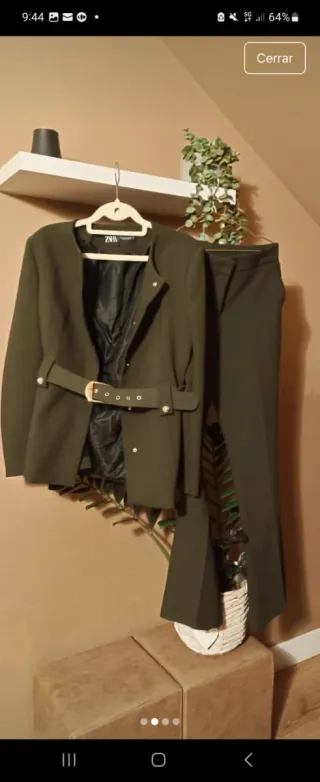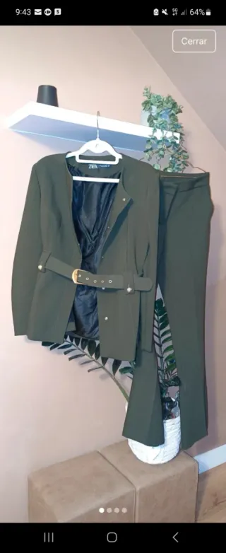 Elegante traje de dos piezas de Zara. - Chaqueta con cinturón y detalles dorados, talla XL pero es pequeño, recomendable M-L - Pantalón a juego talla S
