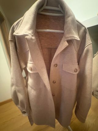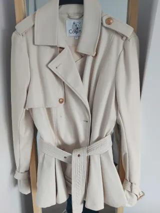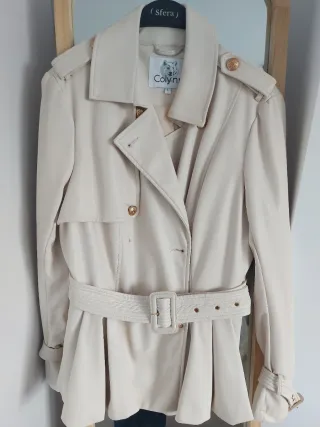 Chaqueta tipo gabardina corta con cinturón. - Diseño elegante y moderno. - Detalle de hombreras. - Puños ajustables con botón. - Hebilla metálica en el cinturón. Le faltan dos botones que se han descosido pero dispongo de ellos.