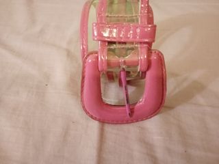 Cinturón fino de color rosa con una hebilla ovalada dorada. - Material: Polipiel. - Hebilla: Metálica dorada. Nuevo sin estrenar nunca