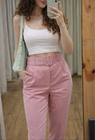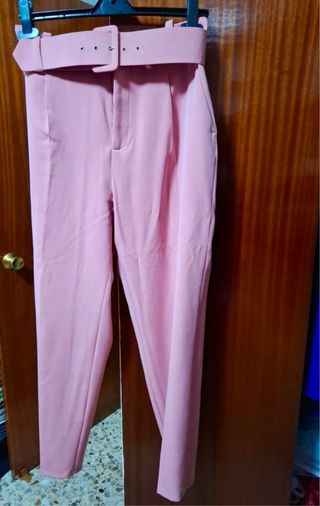 Pantalón de vestir rosa de Zara, tiro alto, con cinturón forrado a juego. Favorece muchísimo la figura y estiliza gracias al corte recto ligeramente tapered. Detalles: • Tiro alto • Cinturón ancho incluido • Bolsillos delanteros • Cierre con cremallera y botón interior • Tejido con elastano (cómodo y se adapta) Composición: 76% poliéster • 17% viscosa • 7% elastano Talla M (equivale a 38) En perfecto estado, usado un solo día. No son pitillo pero tener en cuenta que no son tan tan largos (lo que le aporta el toque elegante considerando el tiro alto de cintura) #zara #traje #mujer #blazer #elegante #rosa #pitillo #oficina