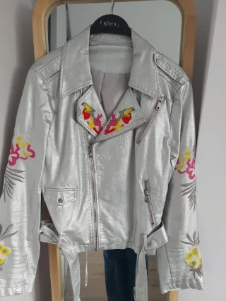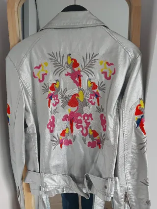 Chaqueta de polipiel con un diseño llamativo y original. - Detalle de bordados de aves y flores. - Acabado plateado brillante. - Cinturón a juego para ajustar la cintura. - Bolsillos frontales con solapa y cremalleras decorativas.