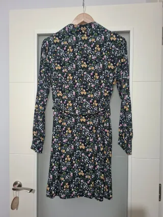 Vestido con estampado floral vibrante y cinturón. - Diseño de manga larga. - Cuello camisero. - Largo hasta la rodilla.
