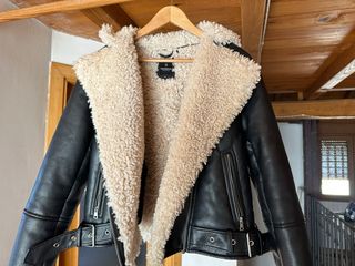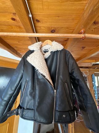 Chaqueta estilo aviador con forro de pelo. - Exterior efecto piel. - Detalle de cinturón con hebilla. - Cremalleras decorativas.