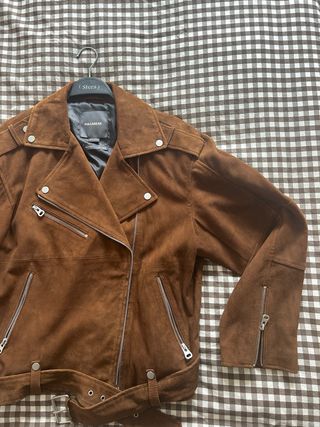Chaqueta estilo motero de Stradivarius. - Diseño con solapas. - Cierre de cremallera. - Cinturón con hebilla.