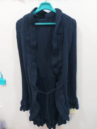 Cárdigan de punto para mujer. - Diseño largo con cinturón. - Mangas acampanadas con volantes. - Cuello con volantes. En perfecto estado.