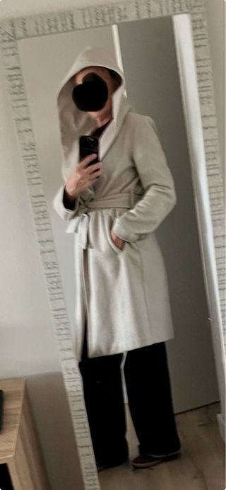 Abrigo largo de color beige con capucha y cinturón. - Diseño elegante y moderno. - Incluye cinturón para ajustar a la cintura. - Capucha integrada.