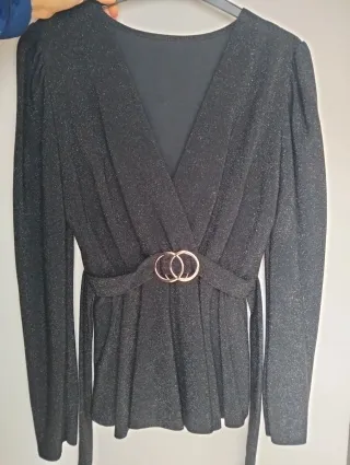 Elegante camiseta negra con un sutil brillo plateado que le da un toque especial. Presenta un diseño cruzado en la parte delantera y un cinturón a juego para ceñir la cintura. - Mangas largas abullonadas. - Detalle de hebilla doble en el cinturón. - Tejido elástico y confortable. Talla única que da desde una 34 hasta una 40 aprox