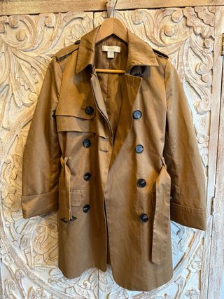 Chaqueta tipo trenca en color dorado, ideal para añadir un toque elegante a tu armario. Se encuentra en perfecto estado. - Cierre de doble botonadura. - Cinturón ajustable a la cintura. - Puños con trabilla. - Solapa con detalle de hombreras.