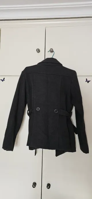 Chaqueta entallada negra con cuello alto. Cuenta con un cinturón para ajustar la cintura y bolsillos frontales. - Cuello alto con detalle de canalé. - Cierre de botones a presión. - Cinturón con hebillas metálicas. - Dos bolsillos de solapa en la parte delantera. - Es xs pero talla como S perfectamente.