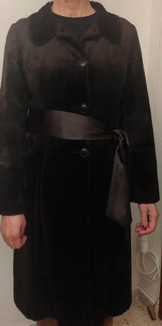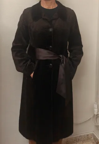 Elegante chaquetón de astracán en tono verde, de la marca Carmen Moreno. Una prenda con un diseño único y textura distintiva. Tiene la etiqueta de la tintorería. El foro es de raso y fabricado en España. Medidas de hombro a hombro 43, largo manga 63, largo chaquetón 72, de sisa a sisa 61, tiene bolsillos en ambos lados. - Diseño con cinturón. - Cuello amplio.