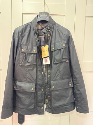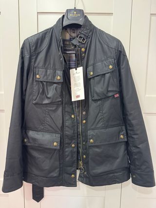 Chaqueta icónica Belstaff Trialmaster para mujer en color negro. Un clásico atemporal con un diseño funcional y resistente. NUEVA CON ETIQUETAS. La vendo porque no me cabe. Talla: UK 10 / IT 42 / US 8 - Cuatro bolsillos frontales con cierre de botón. - Cierre principal con cremallera y solapa. - Cinturón ajustable en la cintura. - Cuello alto con correa y hebilla. - Detalle de bandera británica en uno de los bolsillos.