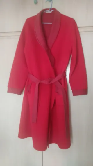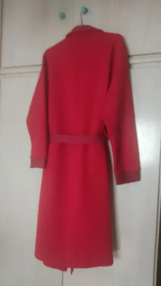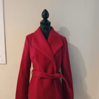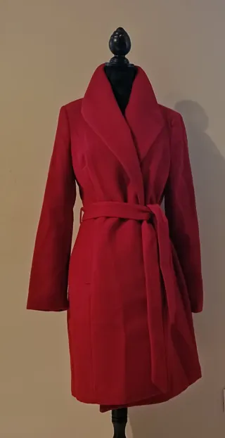 Abrigo de corte clásico en un vibrante tono rojo. Diseñado para ofrecer estilo y calidez. Muy poco usado. En perfectas condiciones. - Cierre cruzado con cinturón. - Cuello amplio y solapa. - Manga larga.