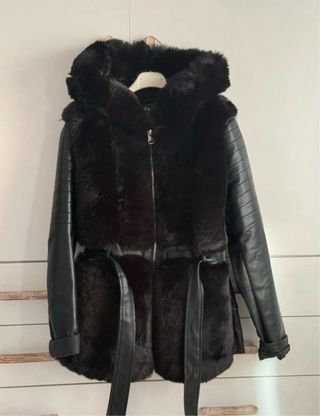 Elegante abrigo negro con cinturón para ceñir a la cintura. Combina piel y pelo para un look sofisticado. - Diseño con cinturón. - Materiales: Piel y pelo.