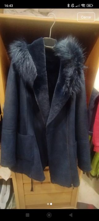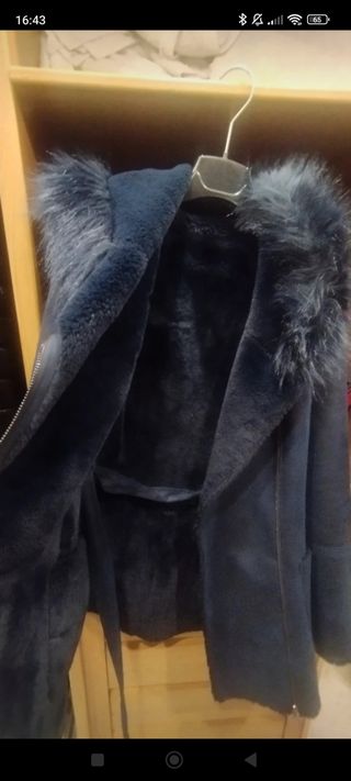 Abrigo de la marca Salsa jeans, en azul marino,, es reversible por un lado de piel de antes y por otro lado de pelo. Su botón para cerrarlo y cremallera y luego cinturón para ajustable. Es un chaquetón súper elegante.