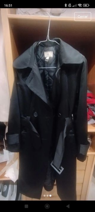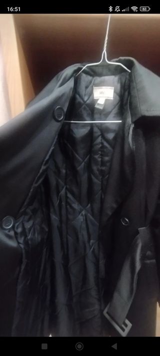 Abrigo de mujer en color negro de la marca INDITEX (ZARA). Cierre abotonada y cinturón. Doble solapas, limpieza en seco (foto etiquetas), talla EUR M. 2 bolsillos laterales con pequeña solapita. Interior forrado y exterior de paño. Ver todas las fotos. Hago envío walapop