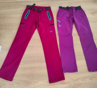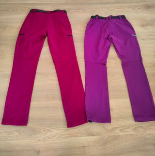 Se venden dos pantalones técnicos de montaña, uno en color rosa fucsia y otro en morado. - Cintura con cinturón incluido. - Cremalleras en los bolsillos. - Diseño moderno y funcional.