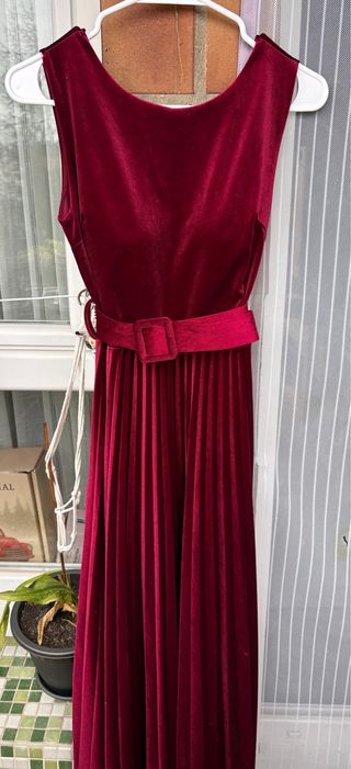 Elegante vestido de terciopelo con un vibrante color rojo y cinturón . Puesto solo un dia - Diseño sin mangas. - Falda plisada. - Copas en delantero y espalda ligeramente escotada