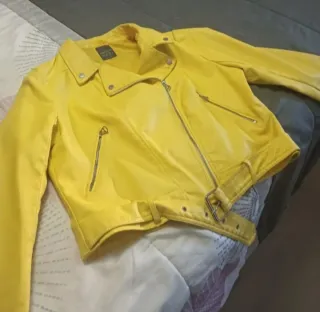 Cazadora estilo motero en color amarillo. - Diseño con cremalleras. - Cinturón ajustable con hebilla. - Cuello solapa con botones a presión.