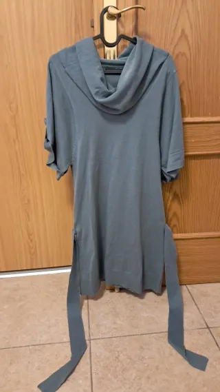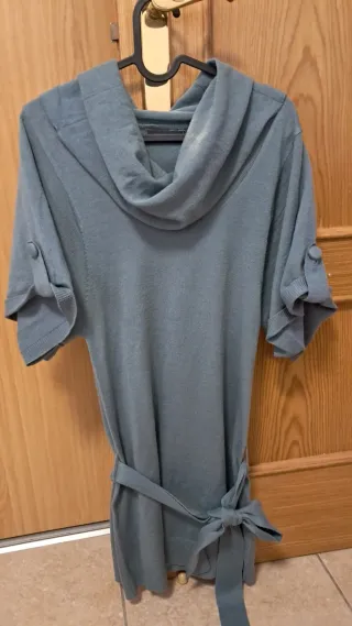 Jersey de punto con rayas y cinturón. Diseño de cuello alto con botones. Con bolsillos delanteros. Cinturón del mismo tejido con hebilla(se puede quitar). Color gris a rayas negras. Talla XS/S. En perfectas condiciones. - Diseño de cuello alto con botones. - Manga larga. - Cinturón a juego.