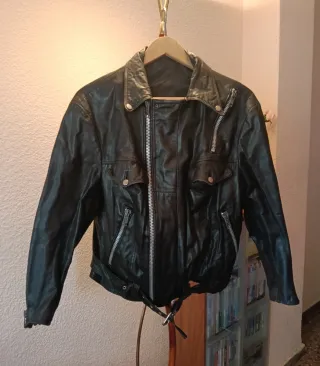 Chaqueta de cuero estilo motero. - Cierre frontal con cremallera. - Bolsillos con cremallera. - Puños con cremallera. - Cinturón ajustable.