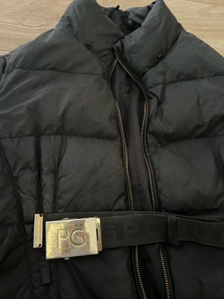 Elegante plumífero de Purificación García en color negro. Perfecto para mantenerte abrigada con estilo. - Diseño acolchado. - Cinturón ajustable con hebilla. - Bolsillos laterales con cremallera.