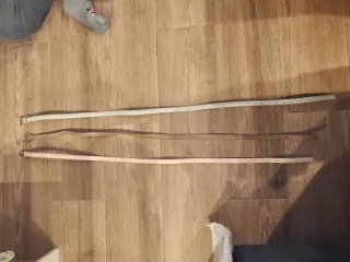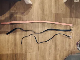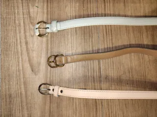 Conjunto de tres cinturones finos para mujer. - Un cinturón blanco con hebilla dorada. - Un cinturón marrón con doble hebilla dorada. - Un cinturón rosa pálido con hebilla plateada.