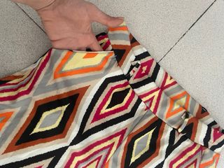 Vestido de manga larga con estampado étnico en tonos azules y naranjas. El diseño presenta un escote en V y una cintura elástica para un ajuste cómodo. - Estampado geométrico. - Mangas largas. - Cintura elástica. - Falda forrada. - Si le incluyes un cinturón al look queda genial. - Aunque sea talla L nones grande. Yo uso una 36 de pantalón.