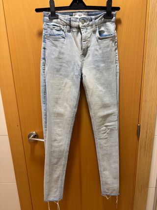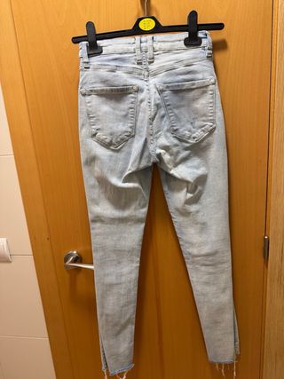 Jeans skinny de Mango para mujer en color azul claro. Tienen un corte ajustado y un acabado desgastado en los bajos. - Tiro medio. - Cintura con trabillas para cinturón. - Cierre de cremallera y botón. - Apertura en los bajos.