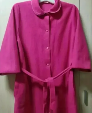 Bata larga de color rosa, ideal para estar cómoda en casa. Presenta un diseño clásico con cuello y cierre de botones. - Manga 3/4. - Incluye cinturón a juego. - Cuello con ribete blanco.