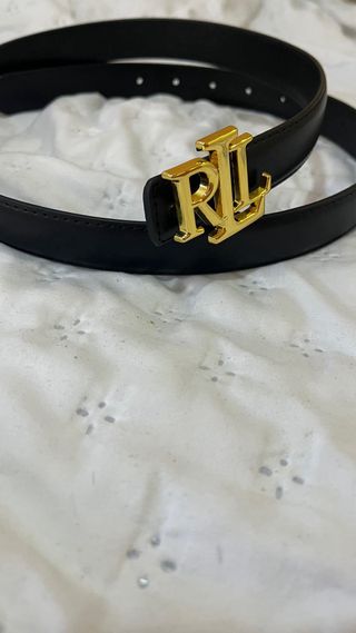Elegante cinturón con detalles dorados. - Hebilla dorada con las iniciales RL. - Correa de cuero negro.