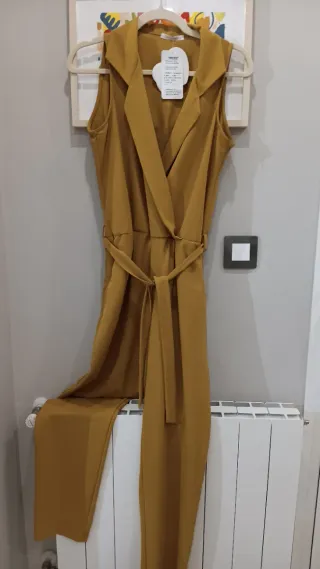 Mono largo de color mostaza con cinturón. - Diseño cruzado. - Cuello tipo solapa. - Sin mangas. - Cinturón a juego para anudar. - color mostaza