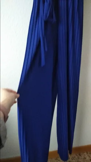 Mono largo de punto ligero en un llamativo color azulón. Presenta un diseño plisado que le da movimiento y elegancia. - Escote pronunciado en V. - Cinturón a juego anudado. - Piernas anchas y fluidas.