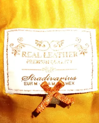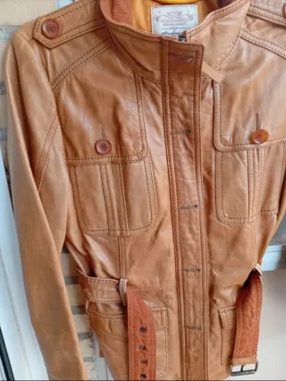 Cazadora de cuero de Stradivarius en color marrón. Es una talla M, aunque puede parecer una S, medidas en las fotos. Cuero real - Diseño con cuello alto. - Cierre de cremallera y botones. - Bolsillos delanteros con solapa y botón. - Cinturón de tela a juego.