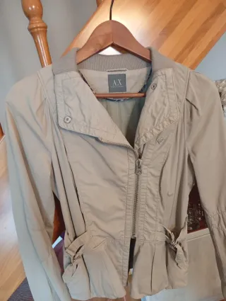Gabardina de la marca Armani en color beige. - Cuello con acabado de canalé. - Cierre de cremallera frontal. - Cinturón ajustable con hebillas. - Detalle de pliegues en la parte inferior.