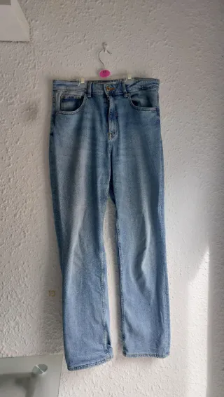Vaqueros ¾ de corte acampanado con un diseño moderno y detalles cuidados. - Tejido vaquero de calidad. - Cinturón de madera incluido. - Costuras en contraste. Pequeño tara atrás ( ver último foto)