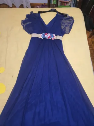 Elegante vestido de fiesta azul, usado solo una vez. Ideal para ocasiones especiales. - Diseño con mangas acampanadas. - Cinturón adornado con flores. - Falda larga y fluida.
