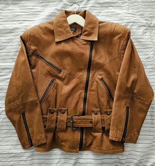 Chaqueta cuero flor Vintage de mujer, talla M pequeña. Cremalleras en bolsillos y puños, cinturón con hebilla de metal. Buen estado de conservación y uso. Forro interior de raso. Marca Muchis Basic fabricante de prendas de cuero argentino.