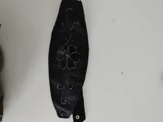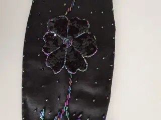 Elegante cinturón negro adornado con un diseño de flores y detalles de cuentas multicolores. Perfecto para añadir un toque especial a tu atuendo de fiesta. - Diseño floral bordado. - Abalorios y lentejuelas. - Cierre de botón a presión. -Medida 67 cm (goma trasera)