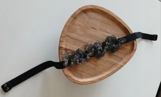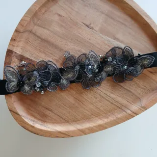 Elegante cinturón negro adornado con delicadas flores y detalles de pedrería. - Diseño floral con apliques. - Cierre con broches. - Adornos brillantes.