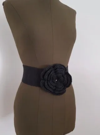 Cinturón elástico con un diseño floral. - Adorno de flor negra. - Banda ancha. Cinturón elástico con una flor de tela en el centro. Mide uno 70 cm de largo, pero al ser elástico da para mucho más.